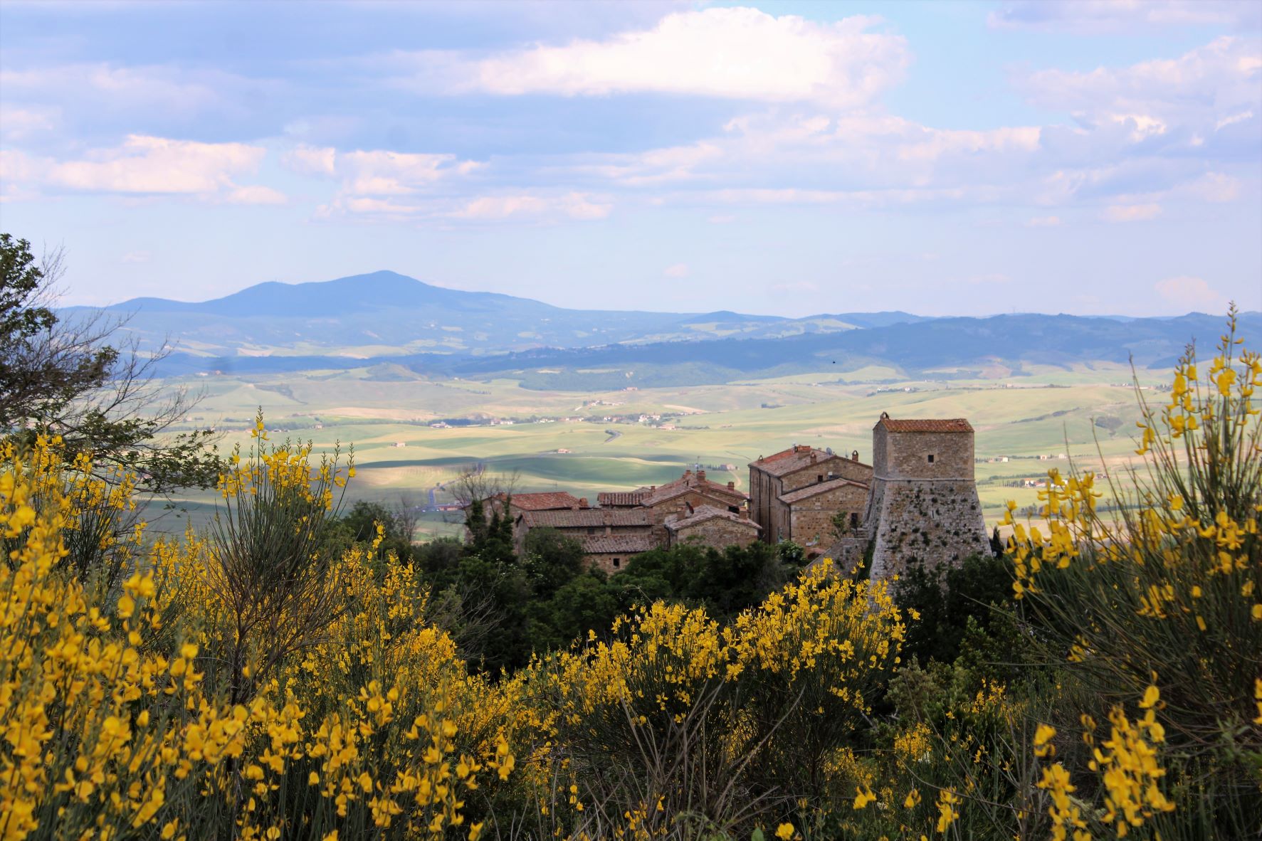 Il borgo di Ripa d’Orcia emerge dietro la ginestra in fiore… ma che secolo è questo?