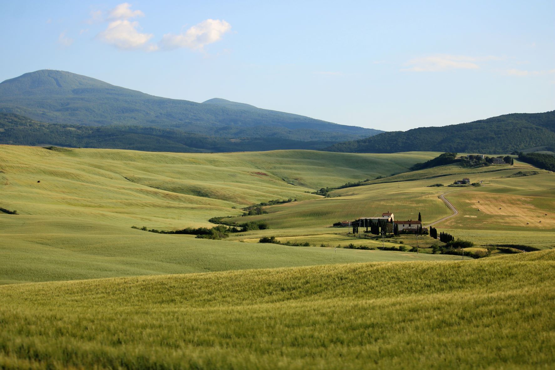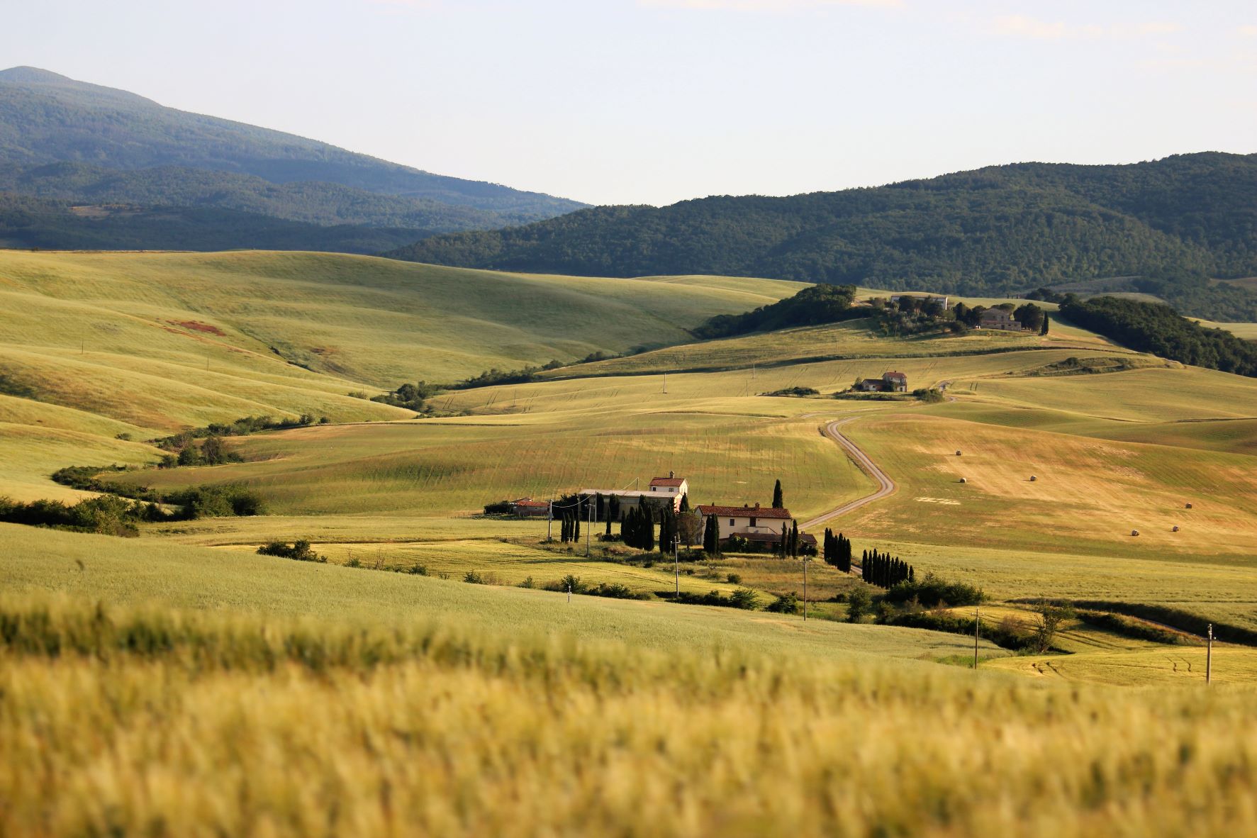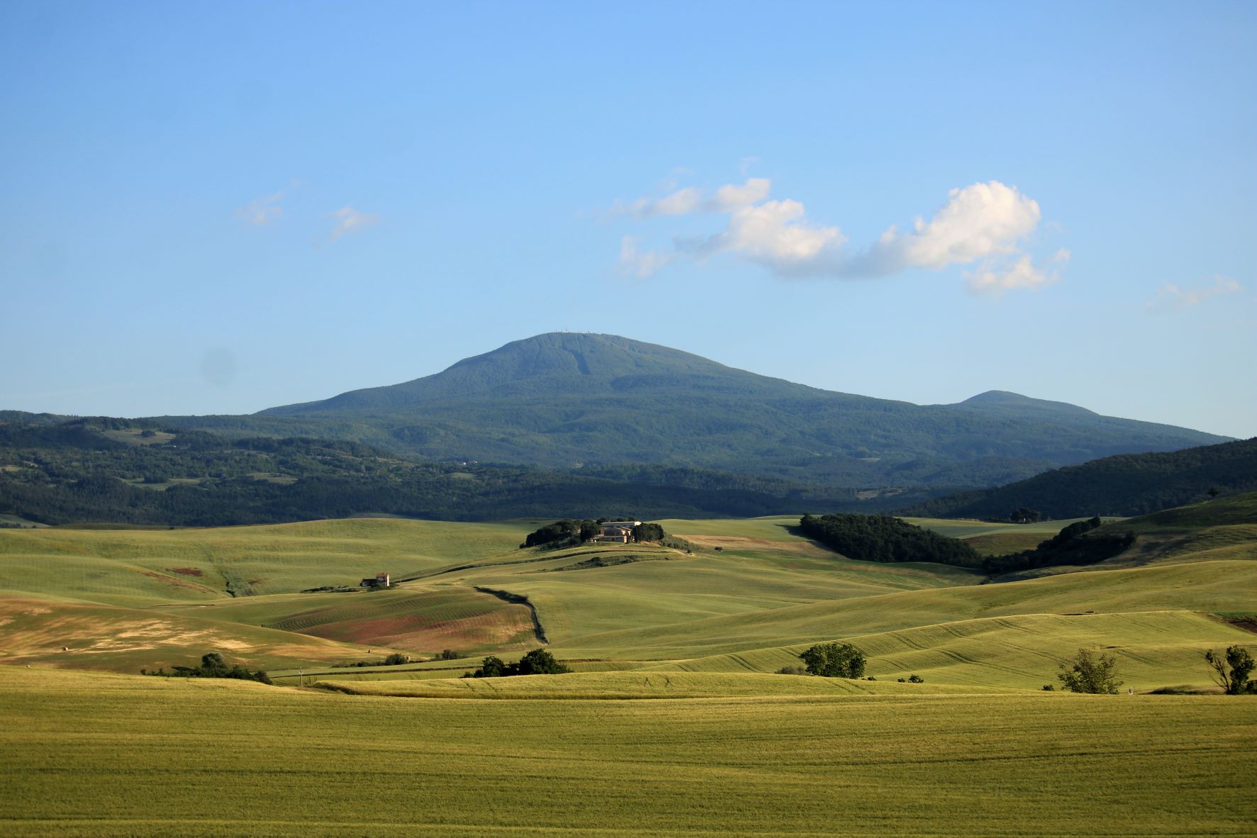 In primo piano, il grano ondeggia nella brezza leggera, mentre le colline del Monte Amiata si vedono in lontananza.