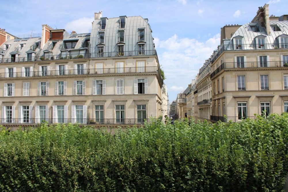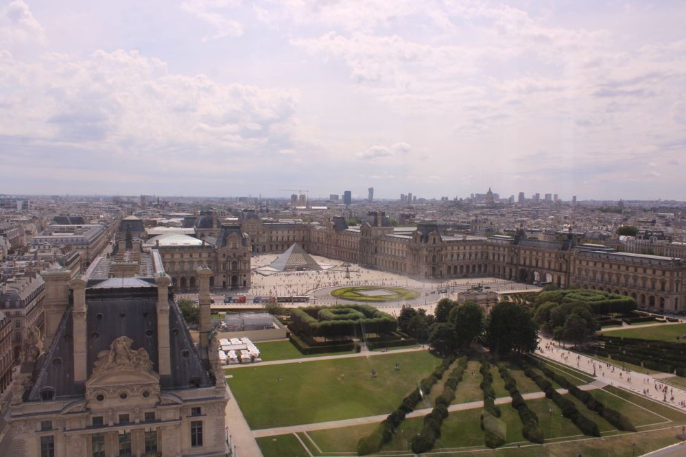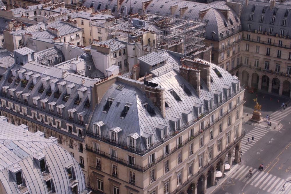 En quelques secondes, nous basculons sur l’autre versant, admirant les alignements des toits de zinc de la rue en contrebas, tandis que Jeanne d’Arc semble bien petite au milieu de la place des Pyramides.