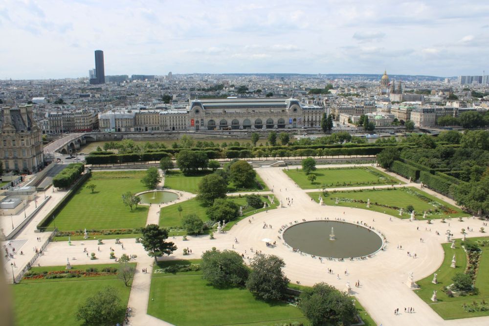 Amis, laissez-vous emporter avec nous dans le mouvement de la roue, et portez vos regards au loin vers le sud ou à pic tout en bas ! Survolez à nos côtés la cité parisienne aux mille charmes incontestés, tel ces bassins du Jardin des Tuileries.