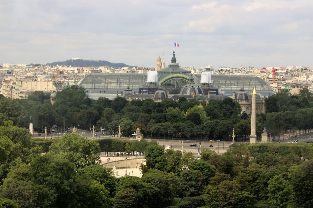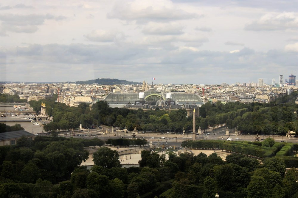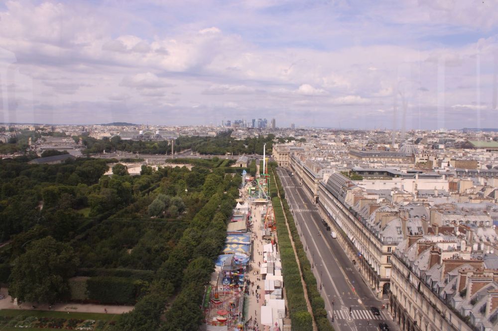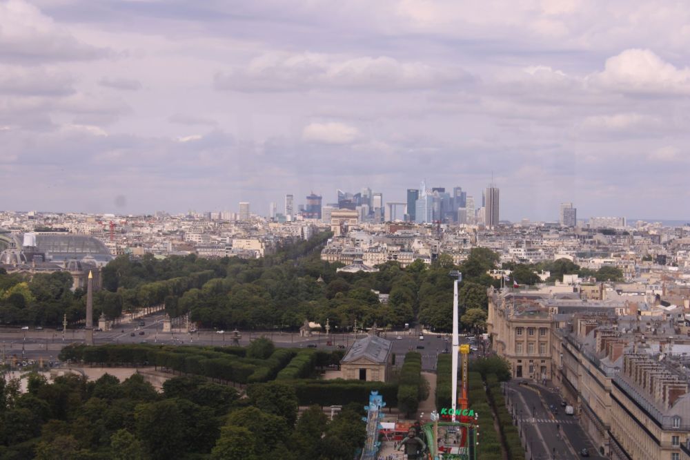…repartant pour un dernier tour, nous voici propulsés au sommet, découvrant dans le prolongement de la rue de Rivoli, la place de la Concorde puis les Champs Élysées jusqu’aux tours de la Défense…