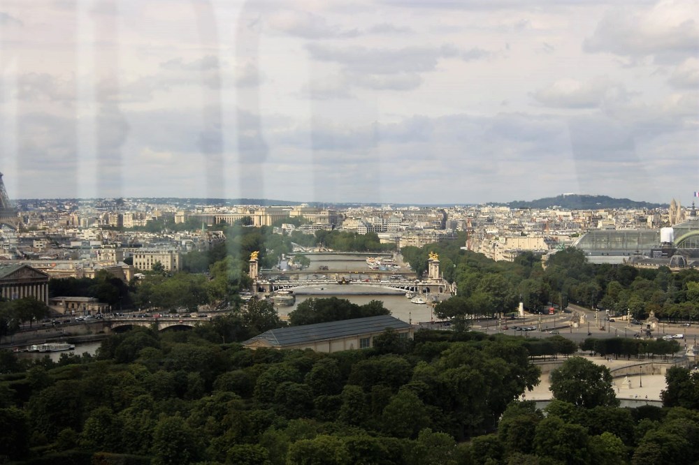 A travers les reflets des vitres de la nacelle, le Palais de Chaillot, avec au premier plan le plus beau pont de Paris, comme dirait mon papa : le pont Alexandre III.