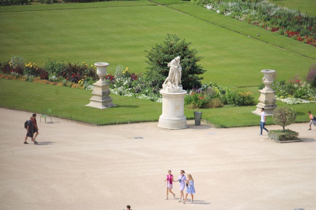 La nacelle s’élève tranquillement et voici que notre regard est captivé par mille éclats et détails de la ville lumière… impossible de tout voir, alors laissons notre regard divaguer et se poser là où cela lui plaît, comme l’oiseau virevoltant qui va de branche en branche… Là il se pose sur quelques promeneurs insouciants dans le jardin des Tuileries…