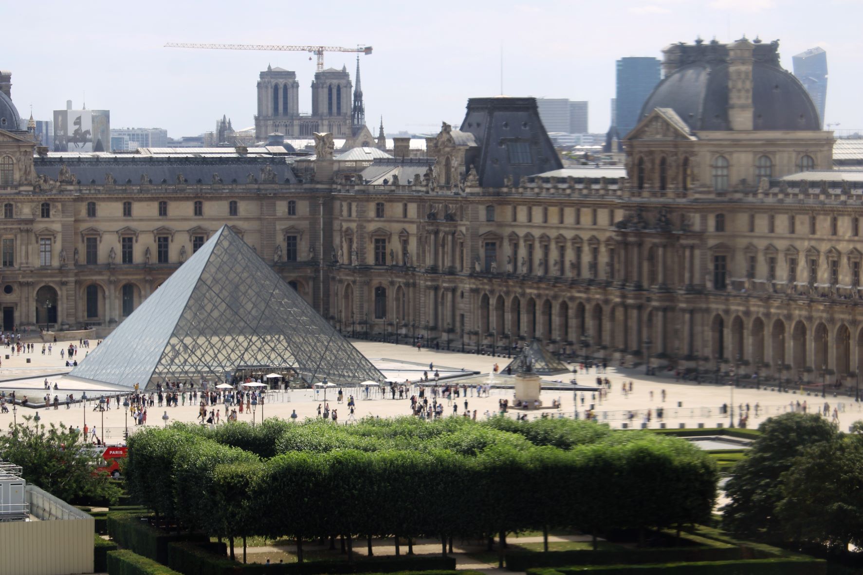 …et voici la pyramide du Louvre, juste sous les tours de Notre-Dame chapeautées d’une grue incongrue…