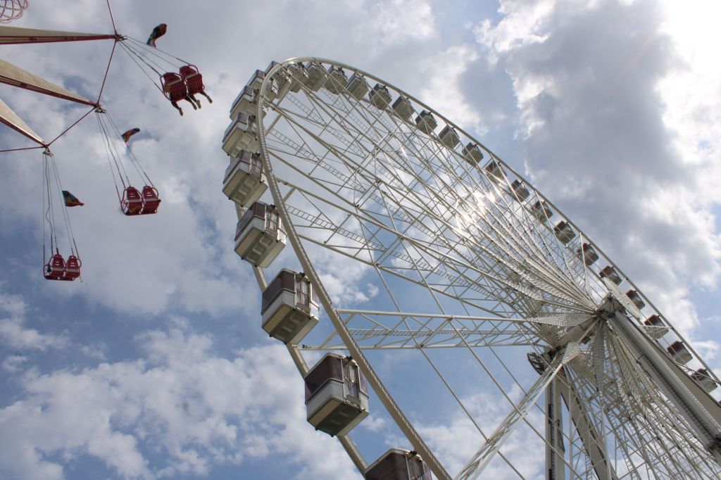 …Non, ce sera plus tranquille et moins agité ! Ce sera au moyen de la grande roue. Le temps de s’installer dans l’une des petites nacelles, et en avant vers les hauteurs au rythme lent de cette géante, pour redécouvrir notre ville et son monde.