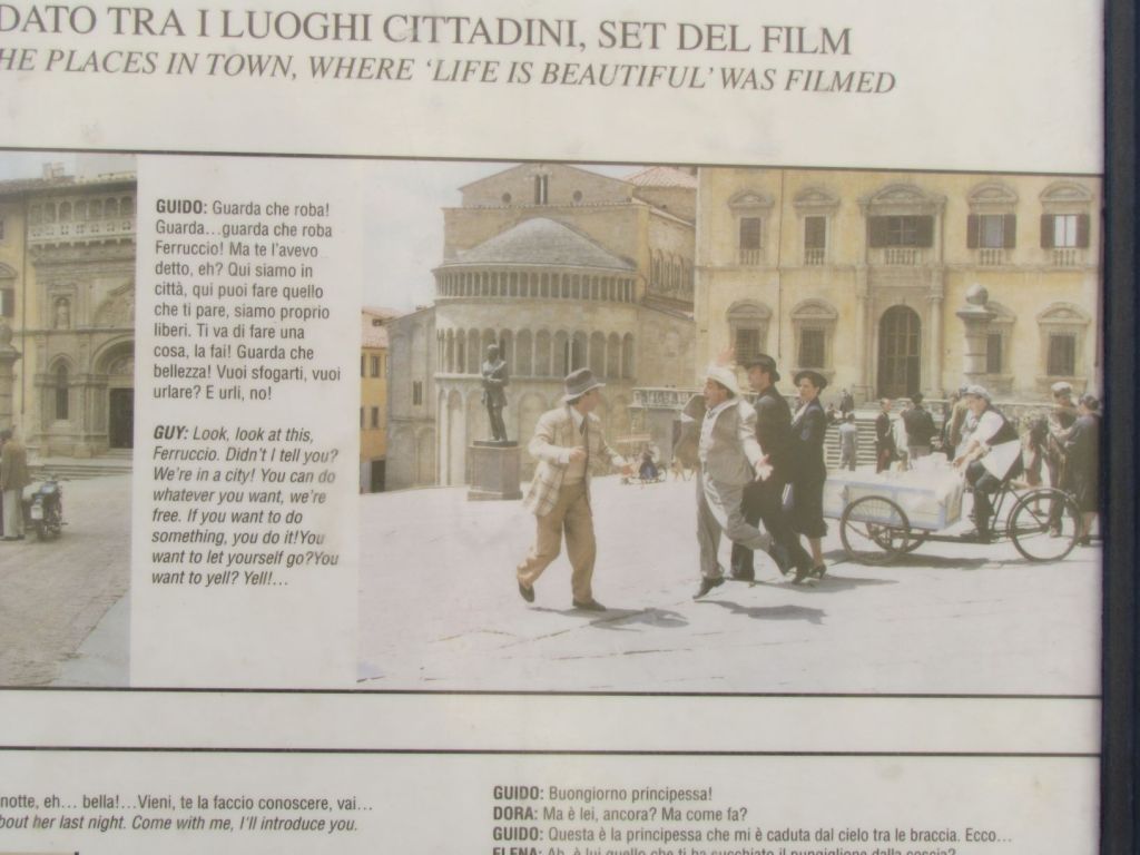 Gira la testa a sinistra della piazza e vedi un cartello poco più avanti. Avvicinatevi e vedrete che è qui che Roberto Bénigni ha girato il suo famoso film « La vita é bella ».