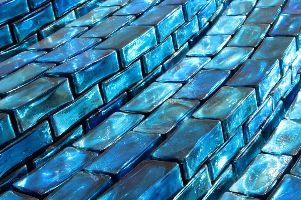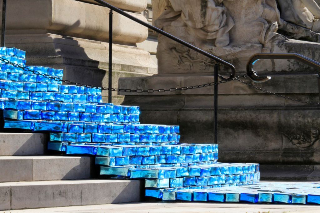 Les escaliers qui conduisent à l’intérieur du Palais sont tapissés de petits lingots dans une gamme de tons bleus. La cascade vient irriguer la ville asséchée.