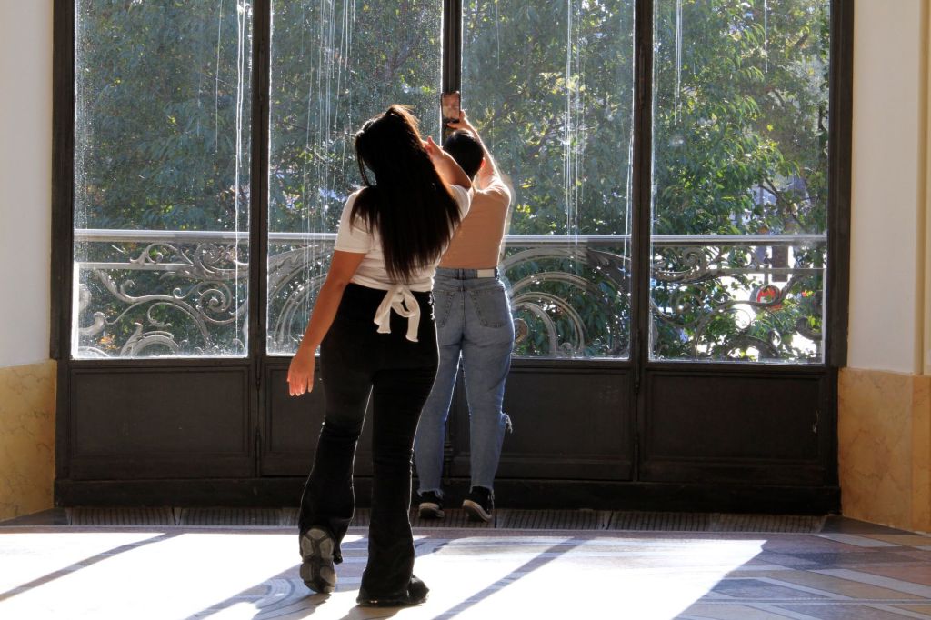Deux jeunes femmes se filment et postent des selfies sous le regard de la Libellule.
