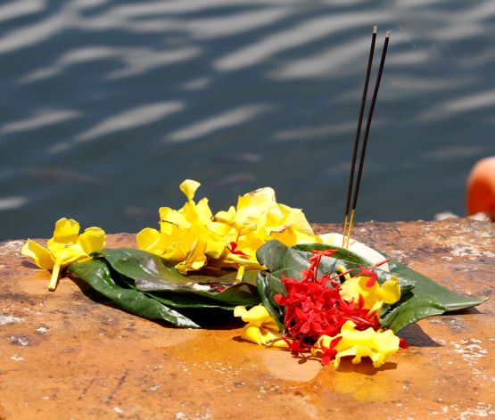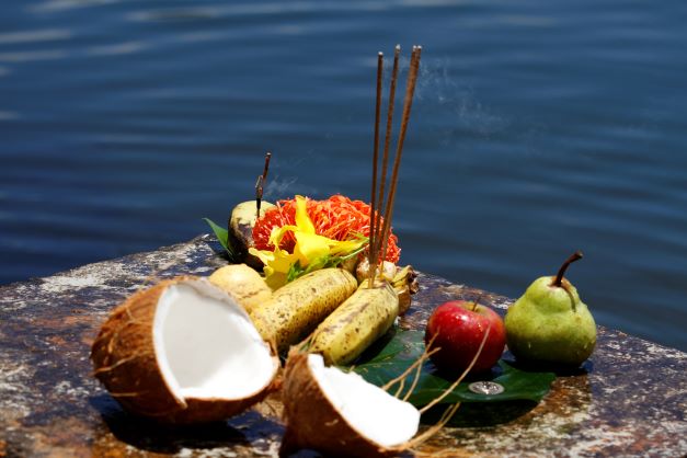 Fleurs et fruits exotiques souvent réunis sur l’autel au bord du lac…