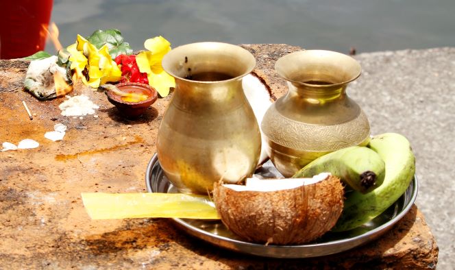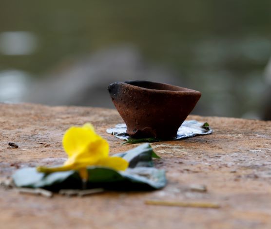 Ghee qui brûle au fond d’une petite coupelle, lait, eau…