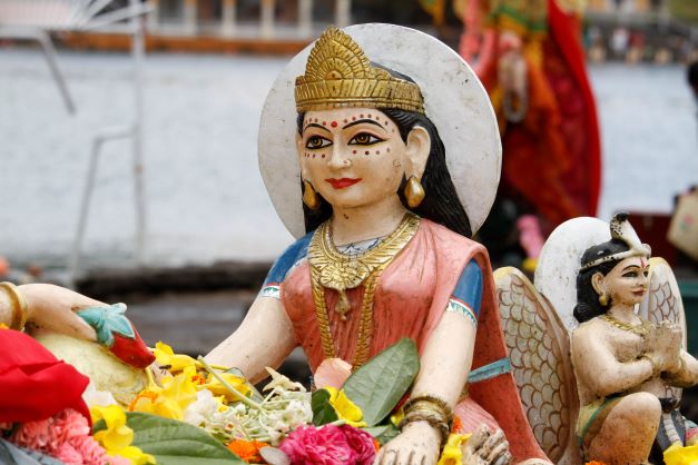Sur le devant du lac, nous apercevons la déesse Parvati, l’épouse de Shiva toute parée de couleurs vives.
