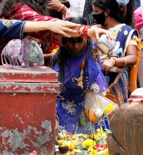 Simples couples, familles, groupes d’amis ou de voisins, tous se pressent devant ces autels de prière pour faire leurs rituels et y déposer leurs dons.