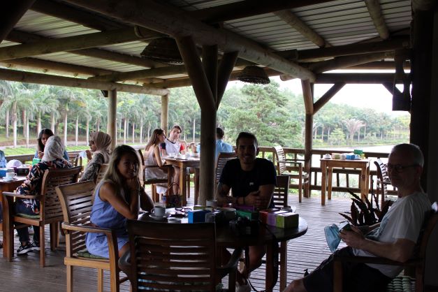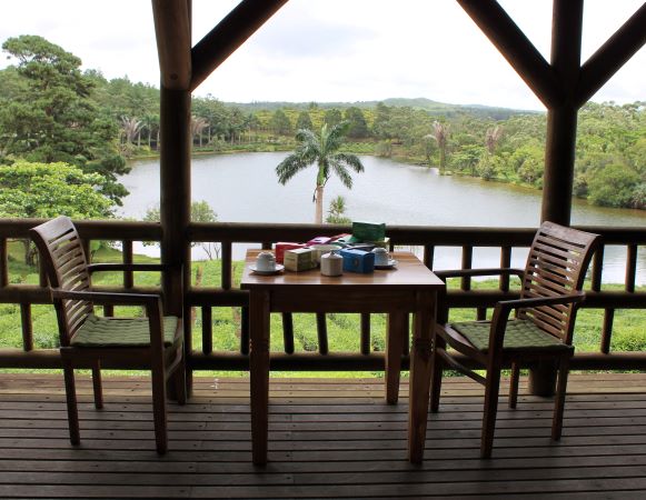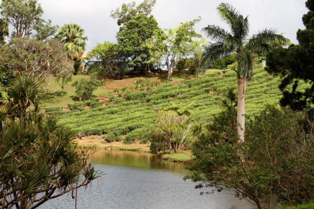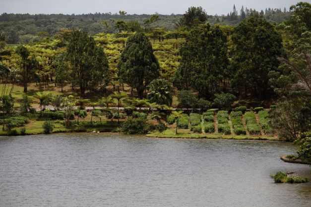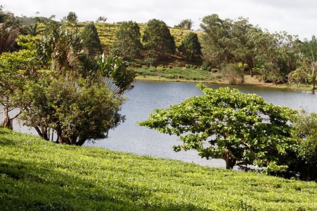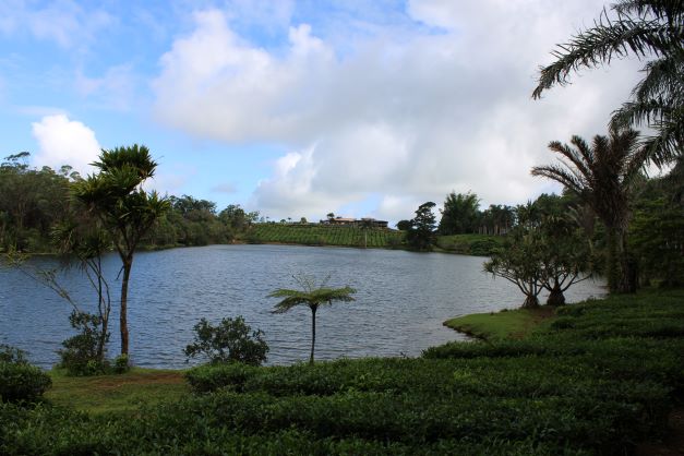 Cocotiers, fougères géantes, arbres du voyageur, arbustes des théiers forment un véritable écrin aux eaux du lac au-dessus duquel émerge le restaurant de la plantation.