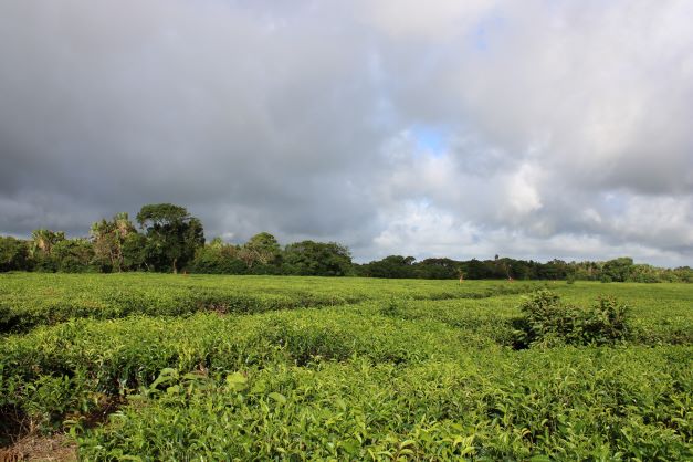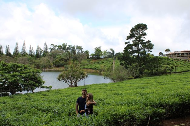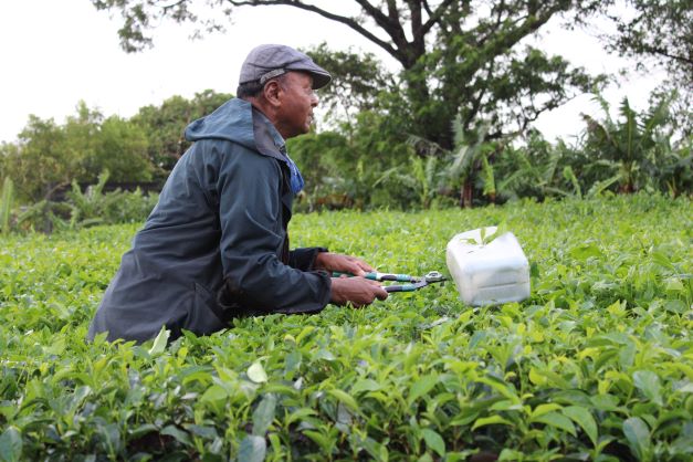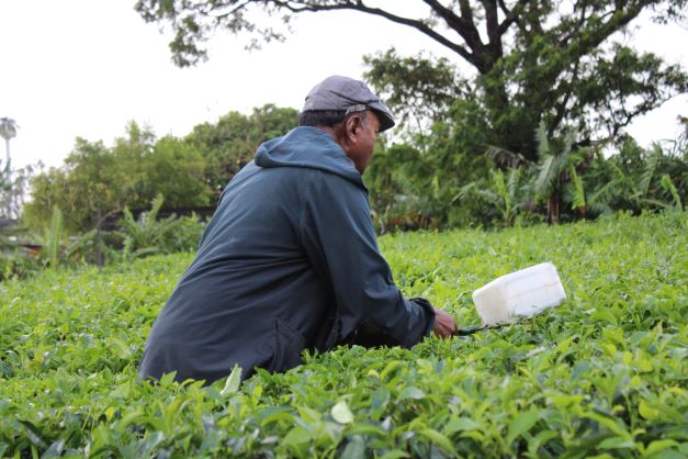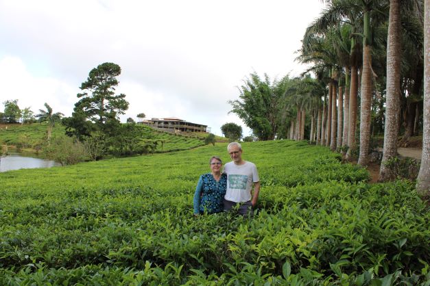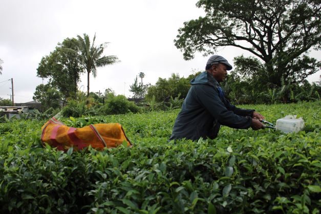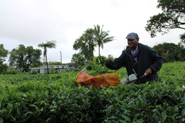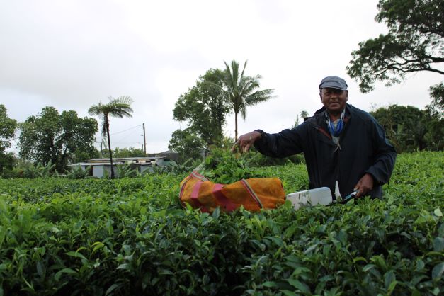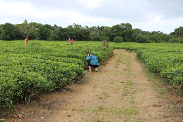 Partis de bon matin de Grand Baie, nous nous laissons guider par le GPS jusqu’à Bois Chéri. Une heure et demi de route, et voici que nous nous retrouvons dans un petit chemin bordé de quelques maisons. Nous qui nous attendions à voir une grande plantations avec de nombreux bâtiments et de vastes plantations de théiers !… ne sommes-nous complètement perdus ? En y regardant de plus prêt, nous nous apercevons rapidement que nous avons renseigné « Bois Chéri » dans notre GPS, et que ce dernier nous a tout simplement conduit « rue » de Bois Chéri, une petite rue à proximité de la célèbre plantation… qui reste cependant invisible à nos yeux. En la cherchant du regard, nous nous apercevons que nous sommes justement au milieu de petits champs de théiers… et que « ca travaille dur » autour de nous. C’est l’heure de la cueillette, toujours matinale, du thé.
