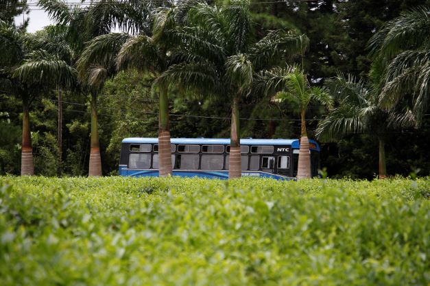 Rejoignant la grande route, nous croisons un bus qui amène des ouvriers à la plantation.