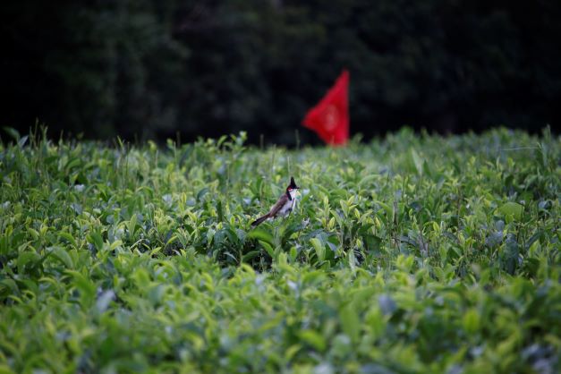 Perché sur les tiges de théiers, un bulbul orphée ou condé semble surveiller les alentours.