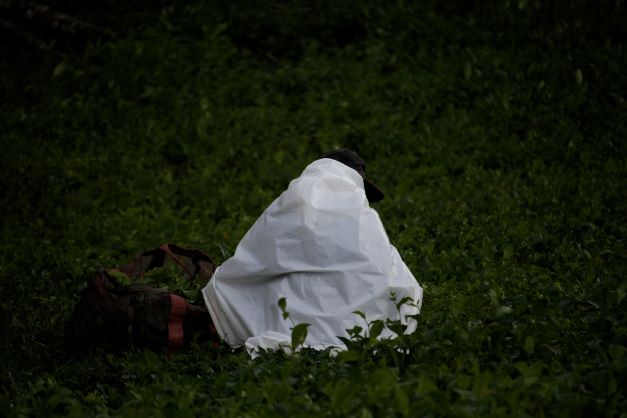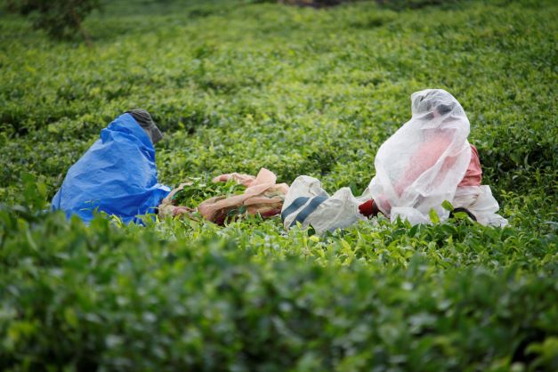 Le temps est humide et les cueilleurs-euses se protègent de la pluie avec des moyens simples mais efficaces. Ici, la cueillette est faite à la main, sans cisaille.
