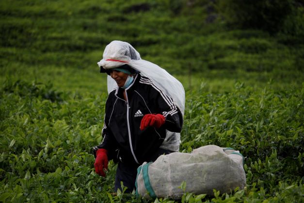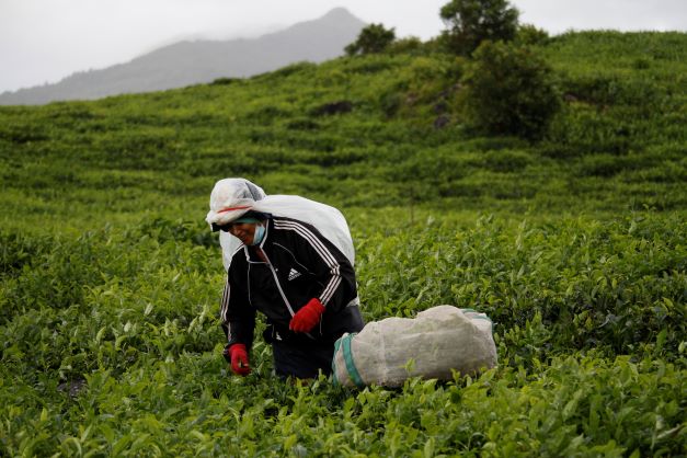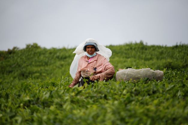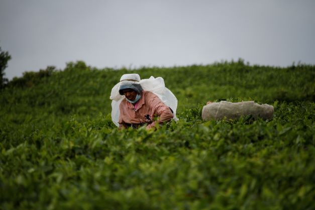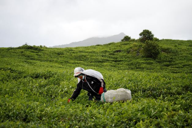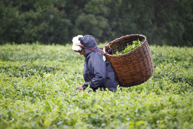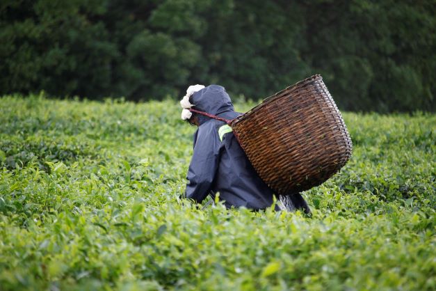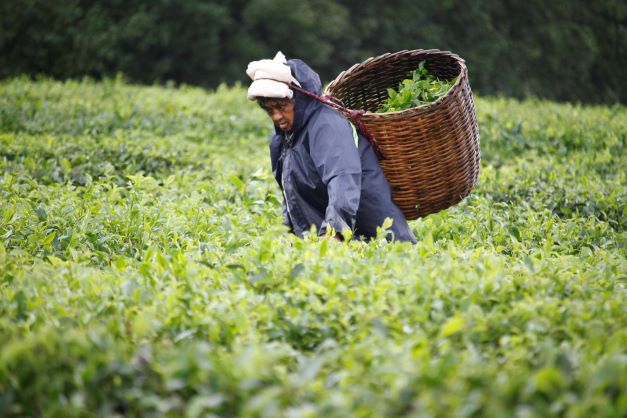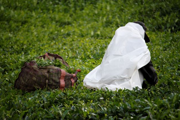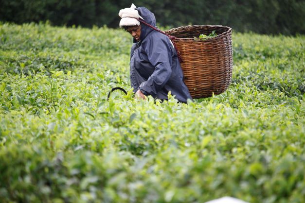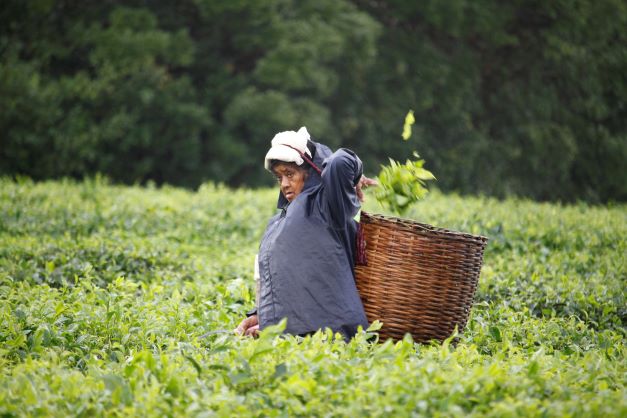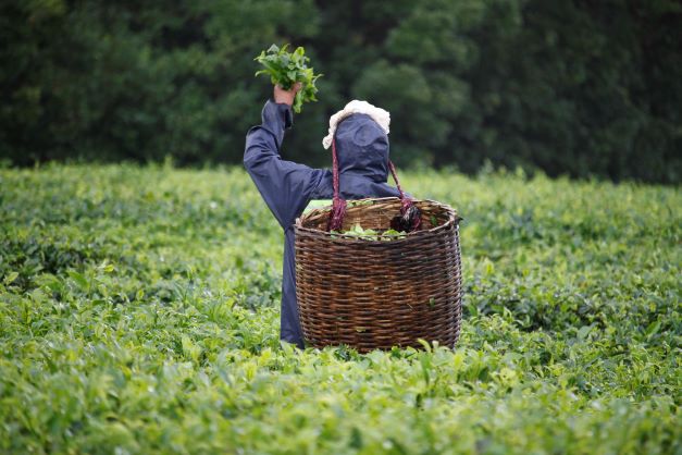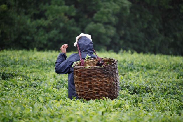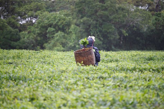 Au milieu d’une mer de théiers, une cueilleuse à l’ouvrage…