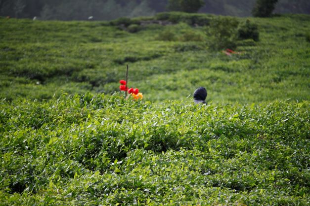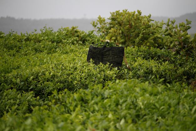 Ici, un sac bien rempli du thé précieux, mais le cueilleur a disparu !… probablement aspiré entre les arbustes.