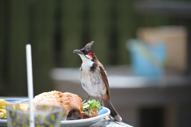 S’amuser enfin en regardant un bulbul orphée qui déguste discrètement un morceau de burger oublié sur la table voisine.
