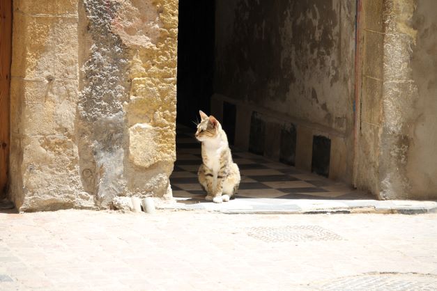 Croiser un chat qui fait le guet, comme au bon vieux temps, sur le pas de la porte d’une vieille demeure, comme il y en a tant dans la Medina et dans les souvenirs de ceux qui sont passés ici.