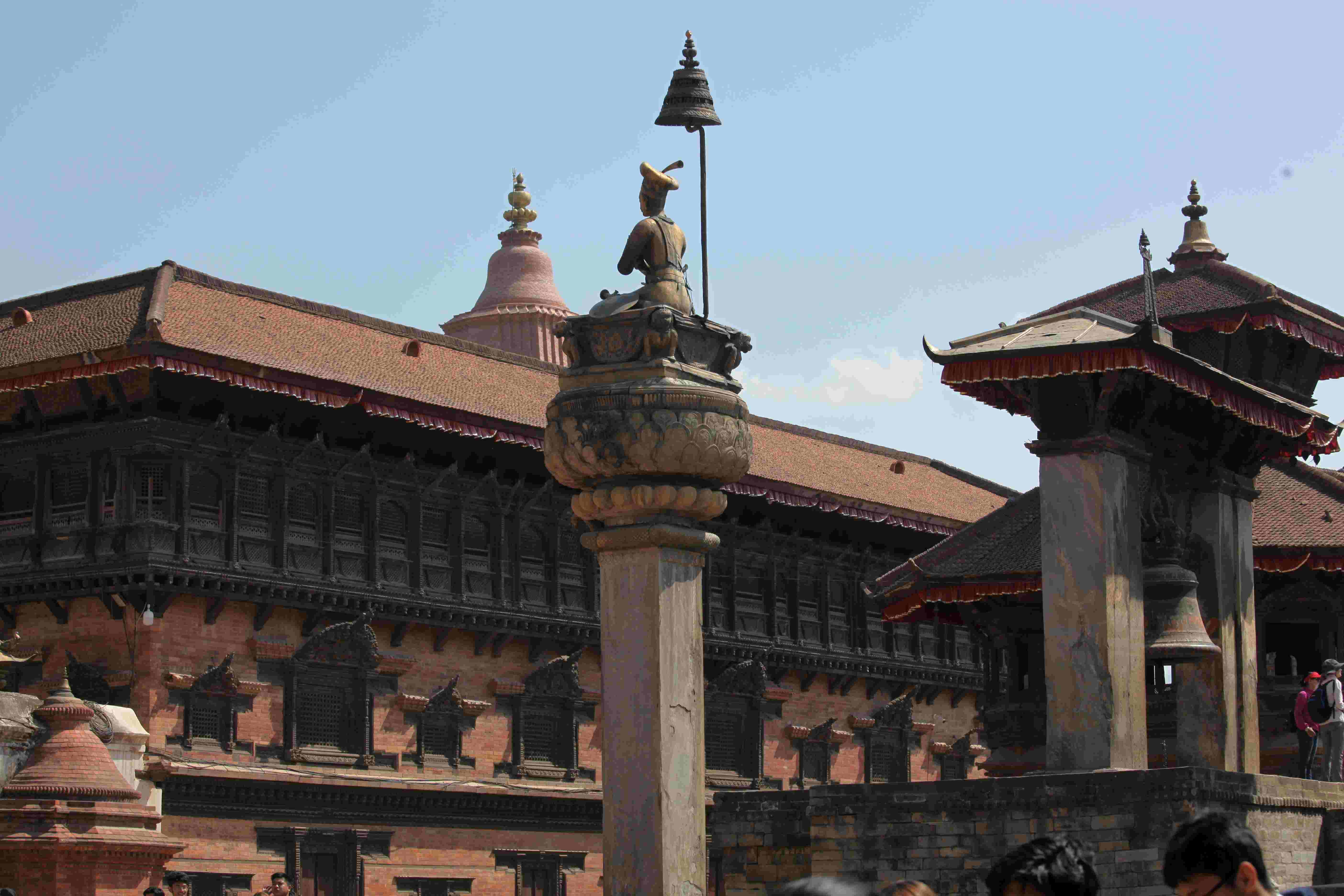 Puis, tranquillement, nous obliquons en direction du monolithe sur lequel est assis le roi Bhupatindra, en train d’honorer Taleju, la déesse de Bhaktapur.