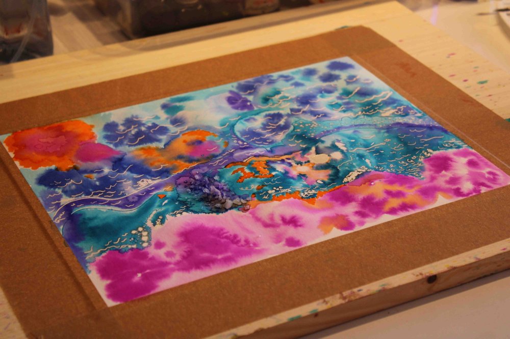 … maniant pinceaux, plumes, encres de couleur, gros sel, eau de javel, coton tige…