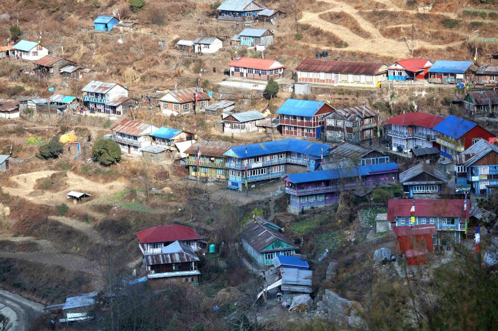 Nous prenons vite de l’altitude et depuis les hauteurs, nous percevons mieux l’harmonie qui émane de ce petit village, avec ses toits bleus et rouilles et ses maisons en bois peint de multiples couleurs.