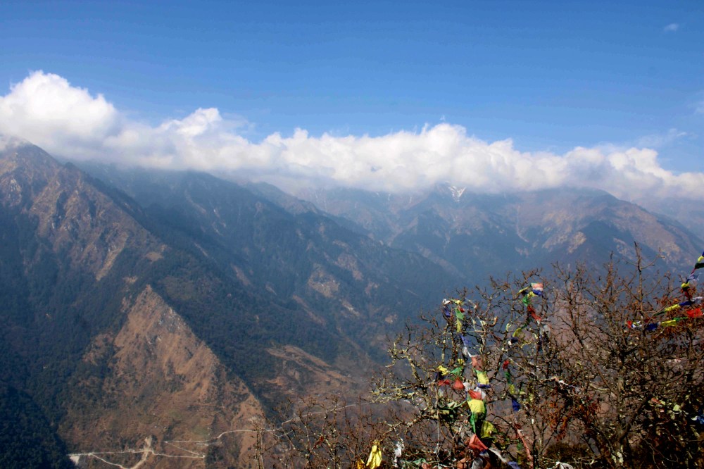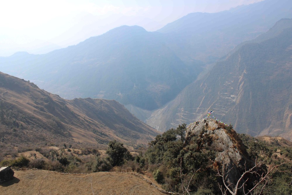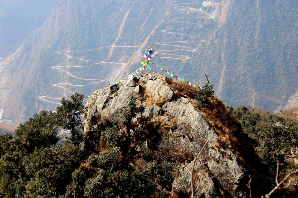 Sur la droite, nous apercevons un monticule avec ses inévitables drapeaux de prière qui s’agitent dans le vent tout en diffusant leurs mantras sur toute la vallée.