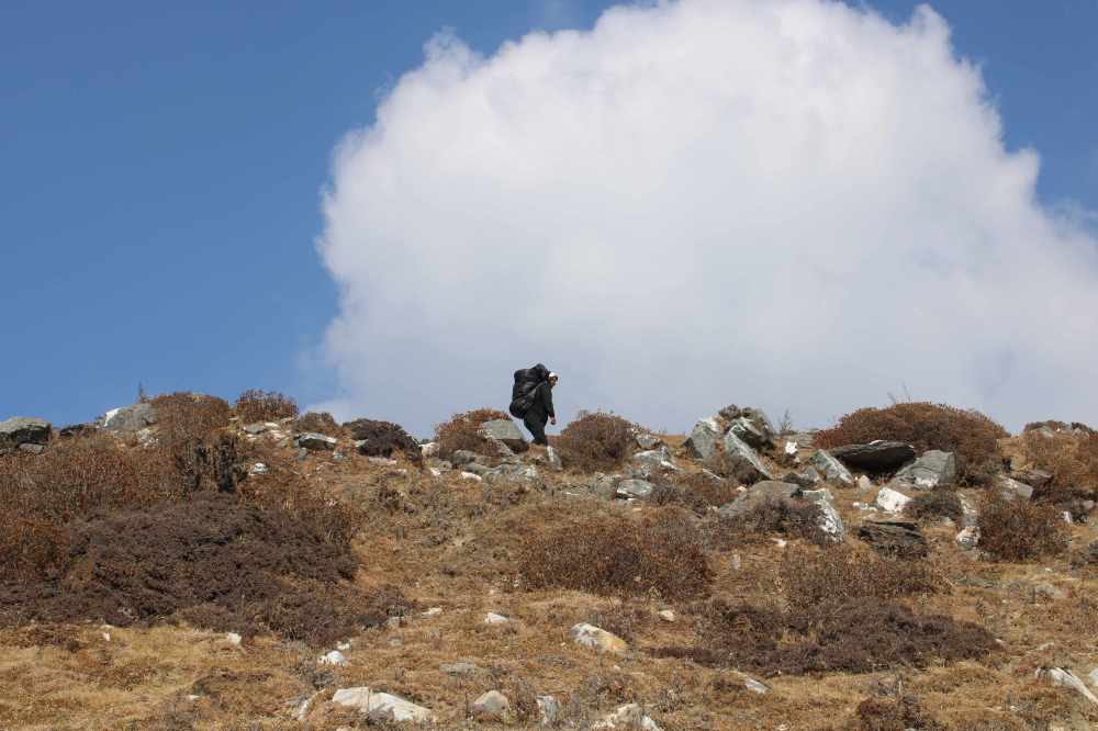 En quelques instants, l’homme est debout avec son énorme fardeau. Il nous rejoindra peu de temps après alors que nous sommes un plus haut dans la montagne. Nous sommes impressionnés.
