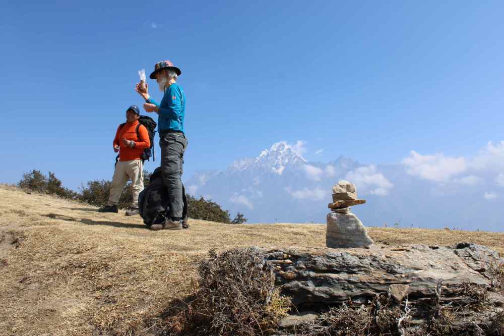Jean-Yves et Prem en profitent pour se restaurer de quelques cookies du trekkeur que nous avons acheté à Thamel Katmandou. Nous vous les recommandons, ils ne sont pas très sucrés et pas trop lourds non plus dans le sac à dos.