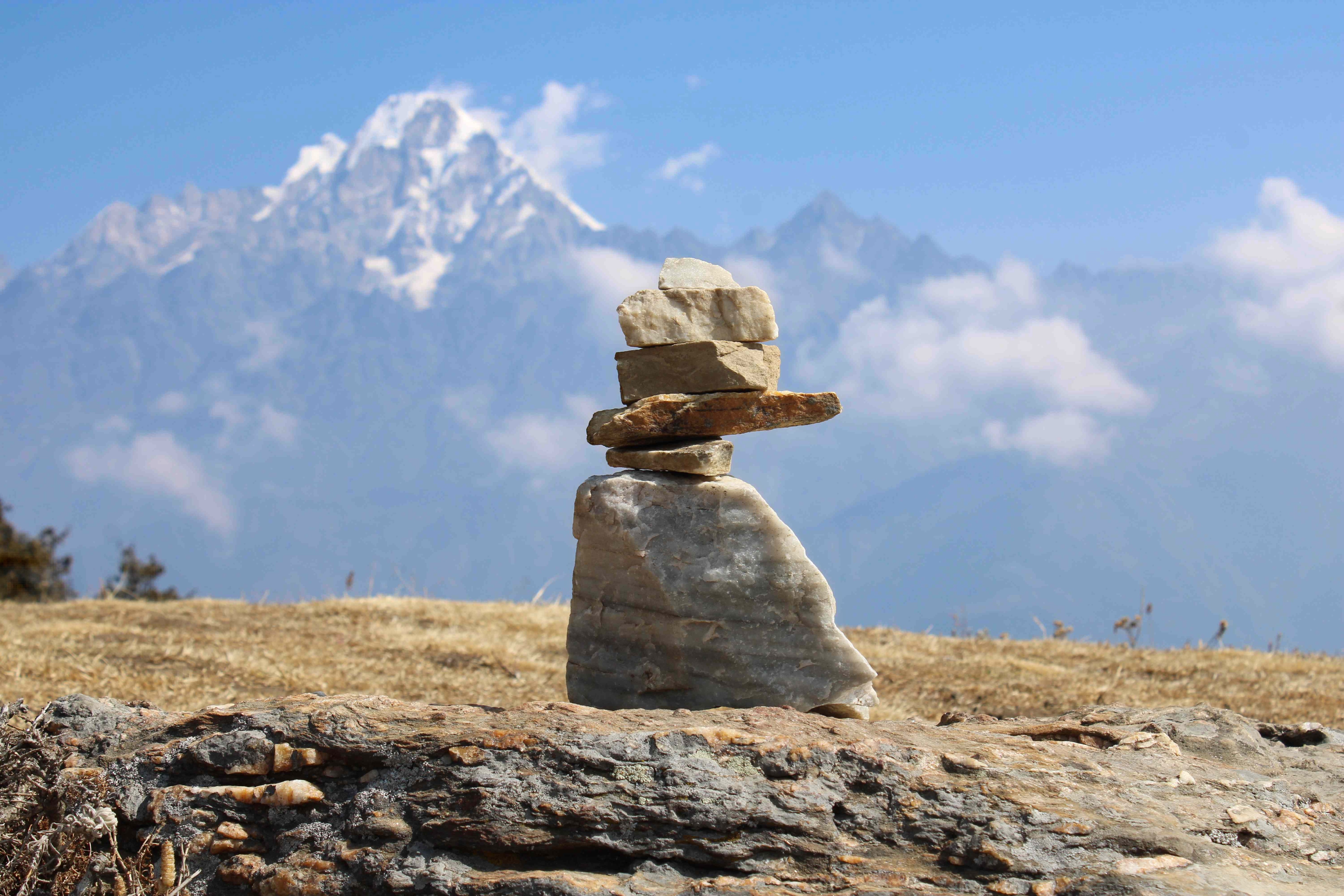 Certains randonneurs sont tellement heureux d’avoir atteint ce point qu’ils y laissent de petits chortens en signe de leur passage. Ne pas oublier…laisser une trace…