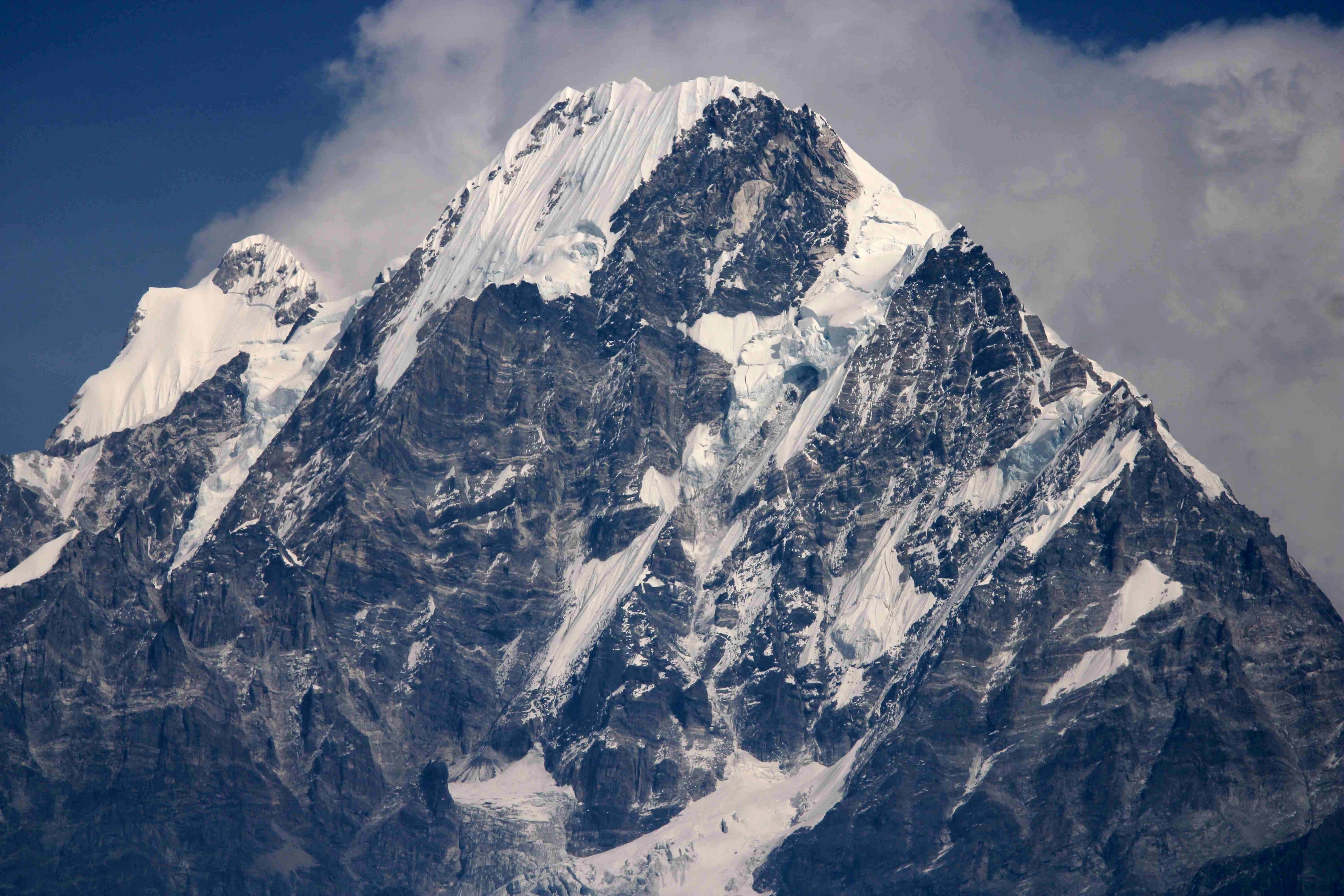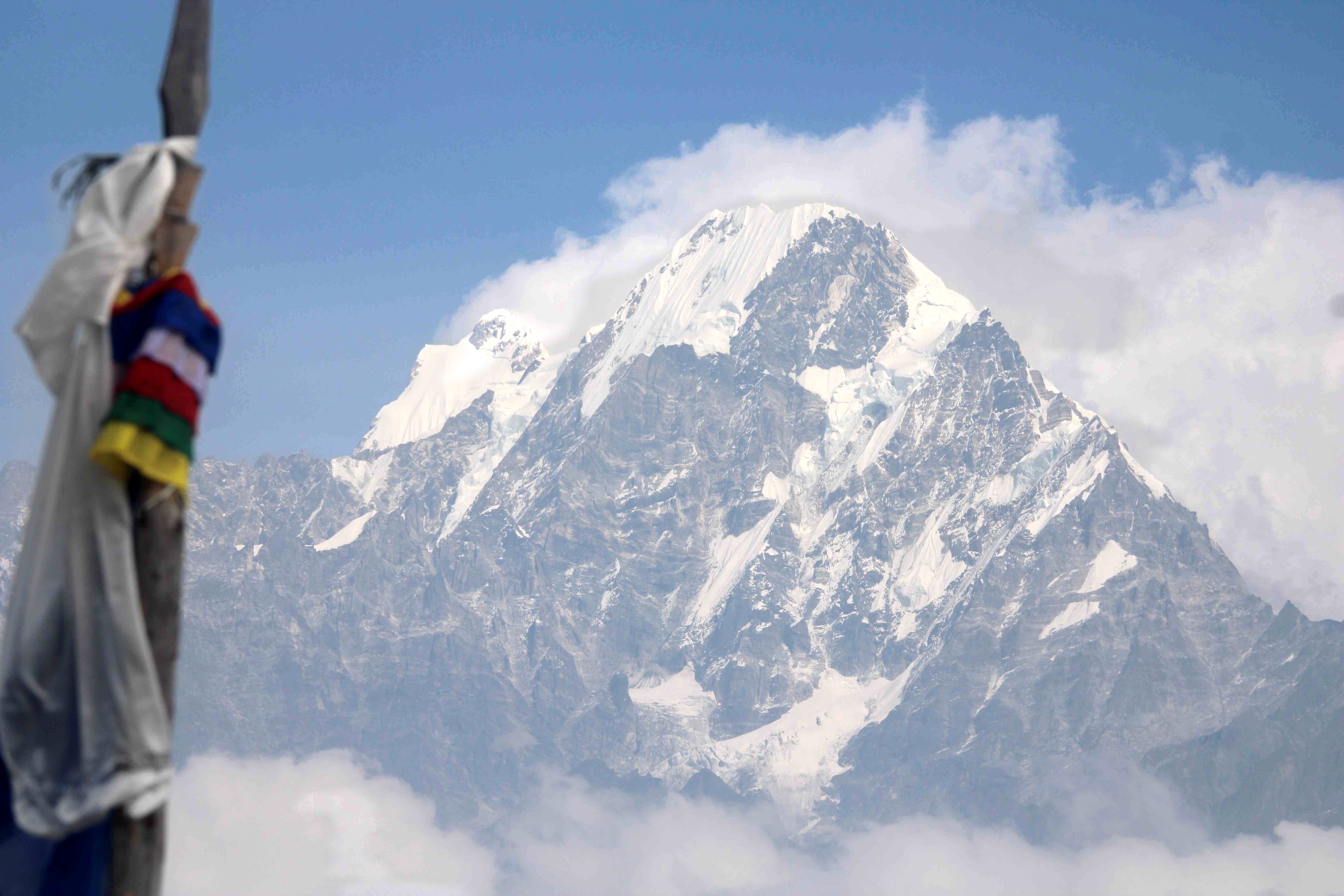 Et pour finir en beauté cette journée, voici la récompense de nos efforts : le sommet du Langtang Himal -6581 m- se dégage parfaitement et nous dévoile ainsi ses plus beaux atours. Nous sommes subjugués. Personne ne peut rester insensible à ses petits plissés de neige au sommet, c’est juste magique.